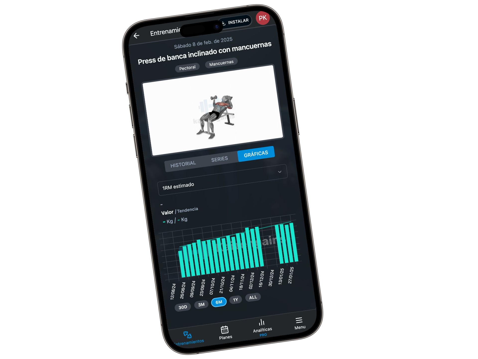 Trackea series, pesos y RIR. Visualiza tu progreso con gráficas de RM estimado y volumen. Comparte tus logros con overlays para redes sociales.